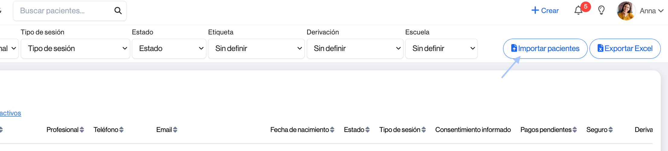 1. Desde el apartado de Pacientes, haz click en el botón Importar pacientes, situado en la parte superior derecha de la pantalla
