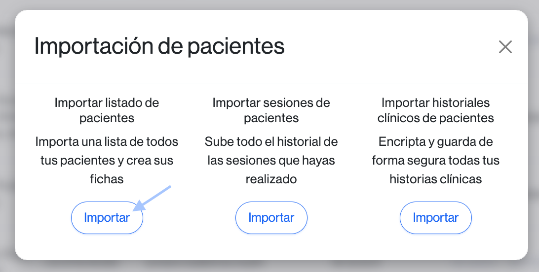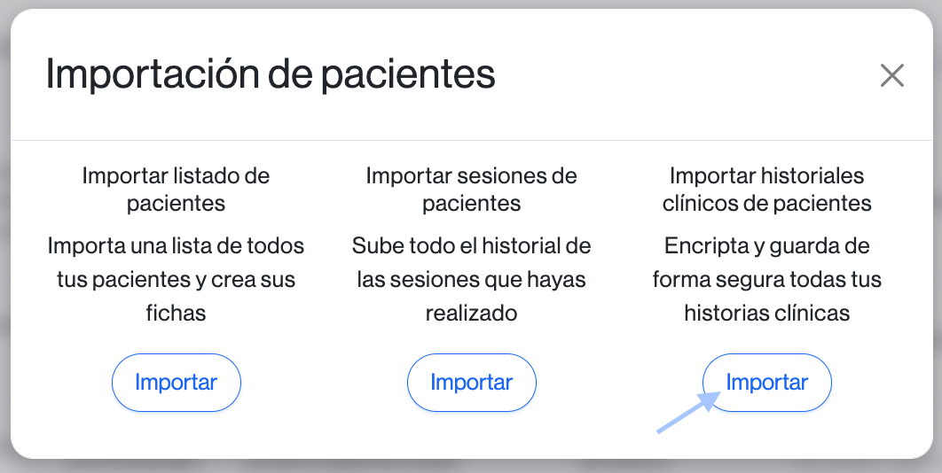 2. Esto abrirá una pantalla que te permitirá elegir si queremos importar los pacientes, las sesiones o las historias clínicas. Para poder importar sesiones e historias clínicas, el primer paso será siempre importar los pacientes