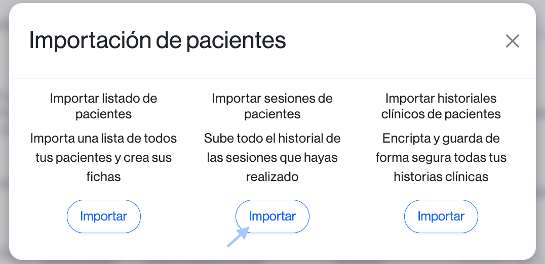 1. Para importar las sesiones, una vez ya tienes los pacientes creados, deberás ir al apartado de pacientes y hacer click en "importar pacientes", como hemos visto previamente. En este caso, seguidamente clicaremos en "importar sesiones de pacientes"
