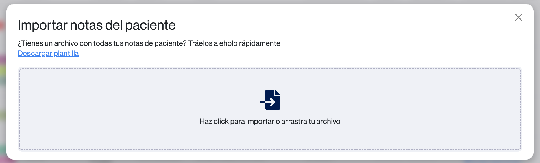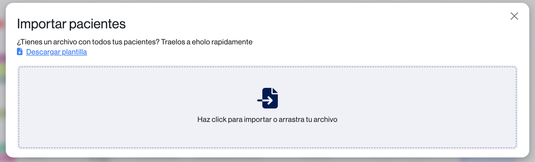 3. Al clicar sobre importar, tendrás la opción de subir tu fichero con la información de los pacientes (podrás cargarlo haciendo click en el centro o arrastrándolo). Si no tienes un archivo preparado, puedes descargar nuestra plantilla y rellenarla con los datos que tengas