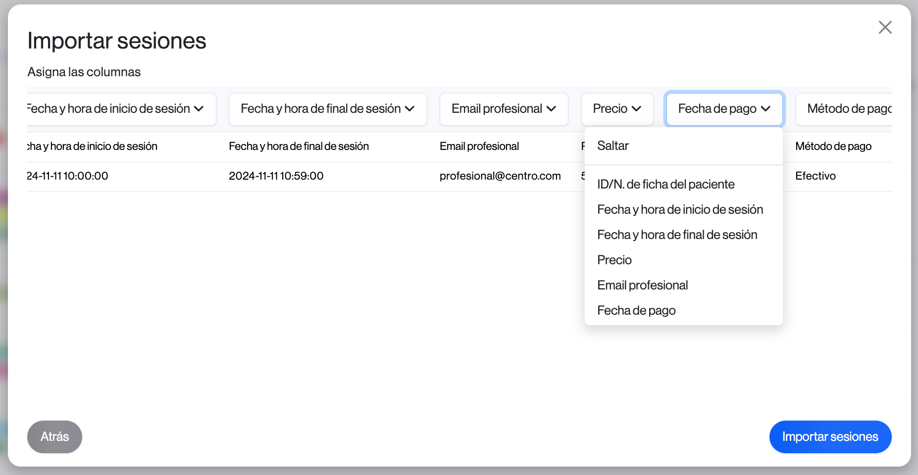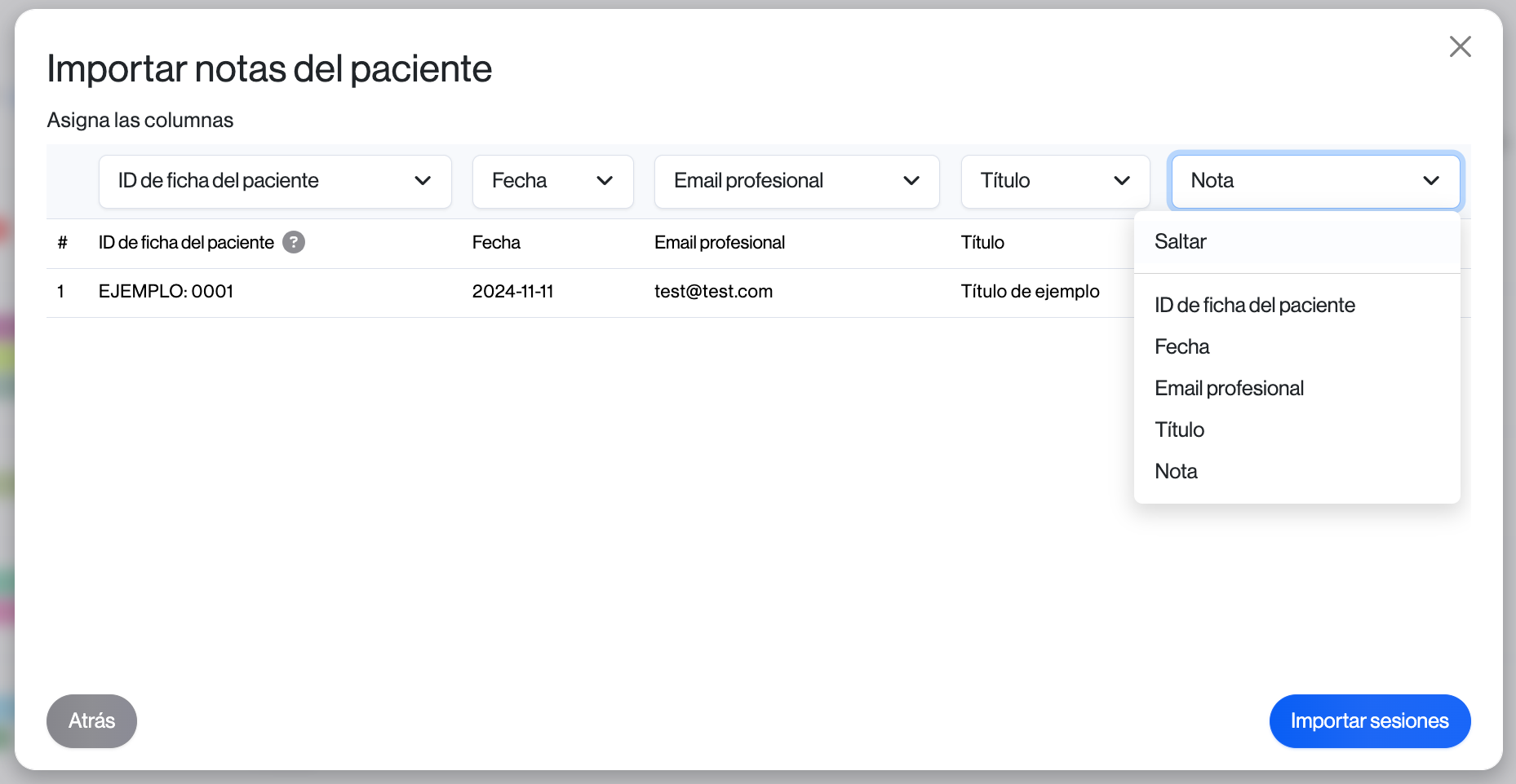 3. Lo siguiente es asignar las columnas correctamente para que los historiales puedan subirse asociados al paciente correctamente. Si hay información extra a la requerida, puedes asignar esa columna con "Saltar"