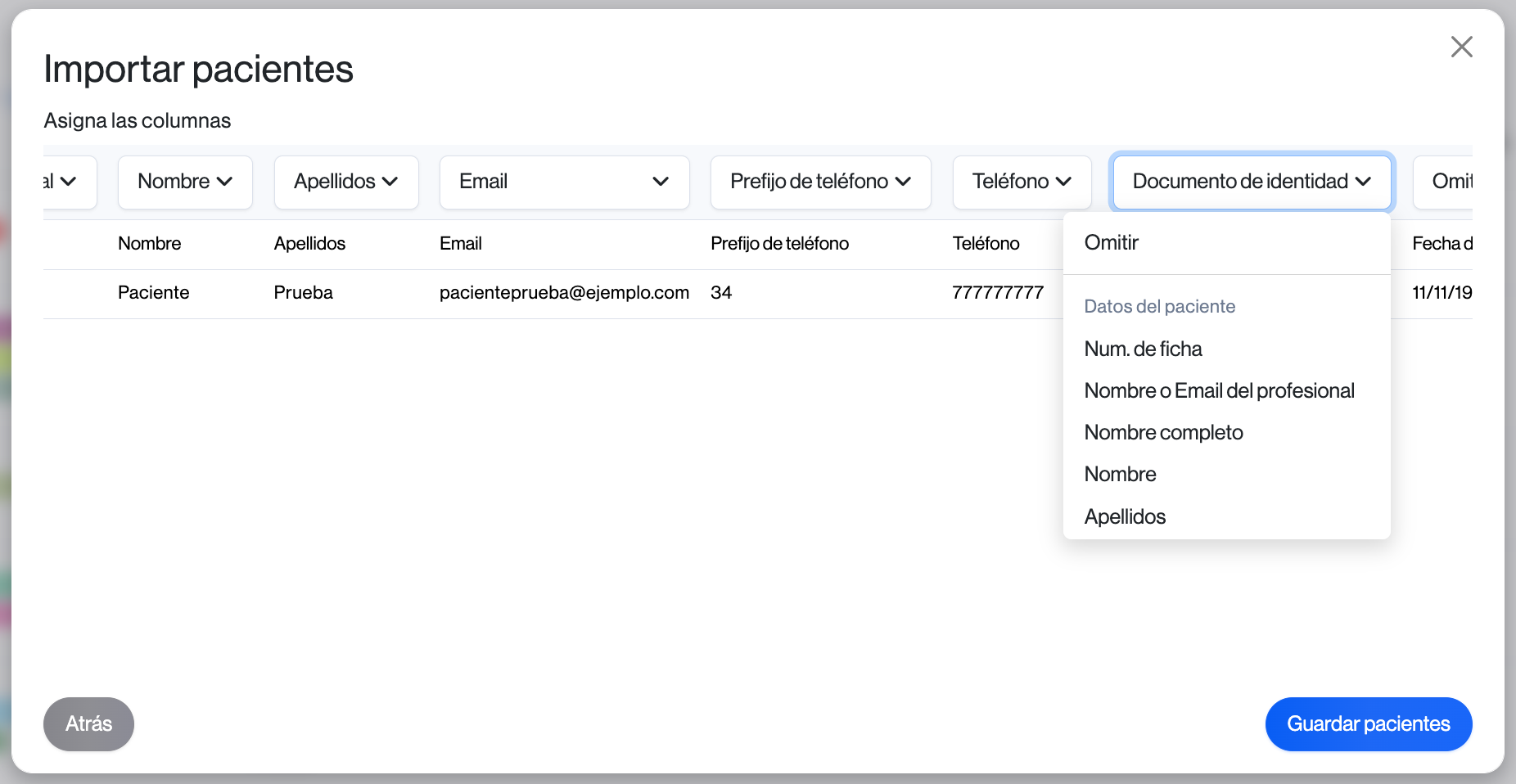Número de ficha del paciente (si aún no tiene número asignado, en el fichero previamente a la subida podemos añadir una columna y asignarles un número)