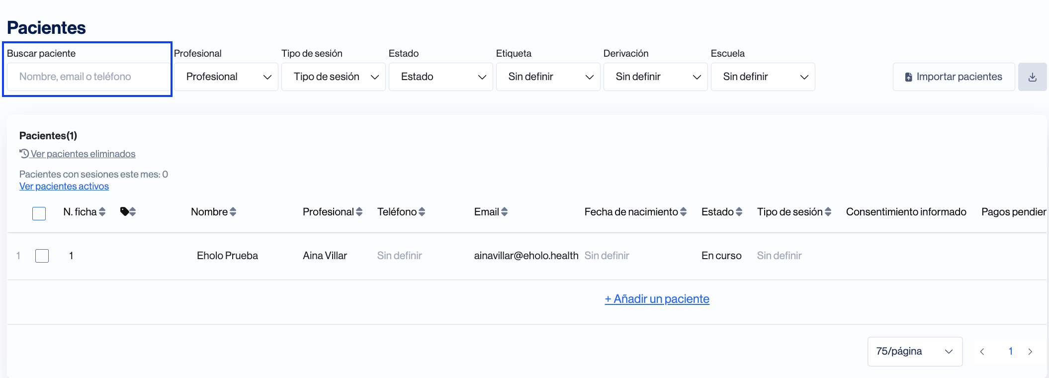 2. Una vez dentro, busca al paciente por su nombre, mail o número de teléfono.