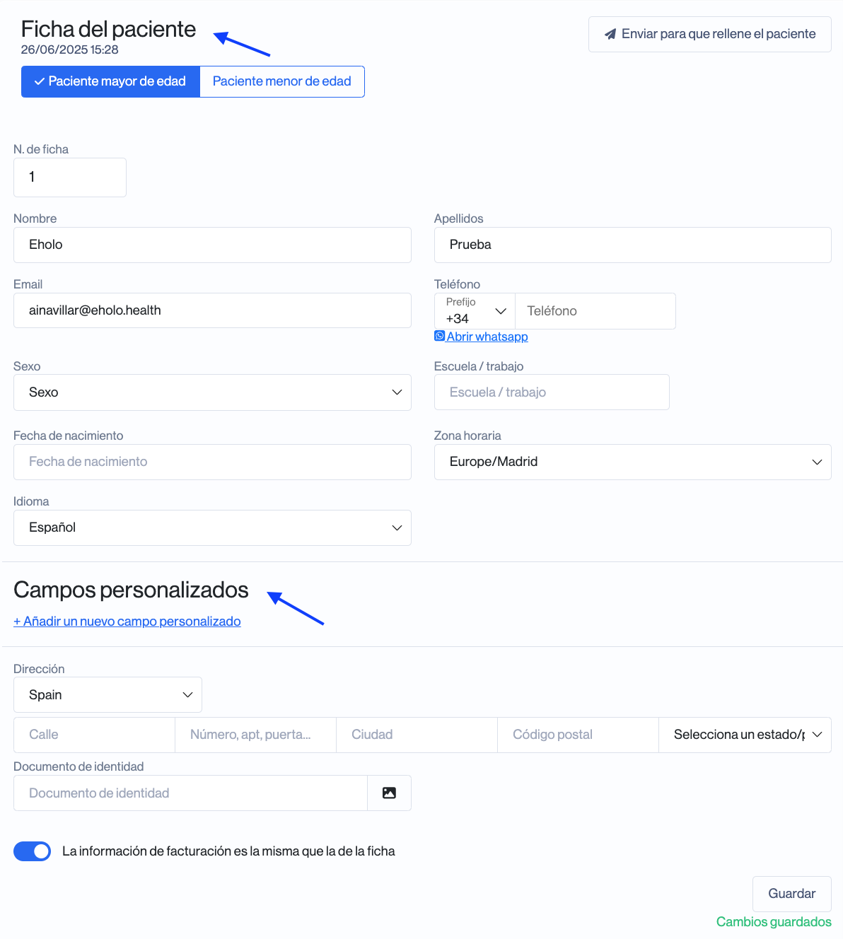 Si la información de la facturación es diferente que la de la ficha del paciente, deberás desactivar la opción de abajo y añadir la información de la facturación.