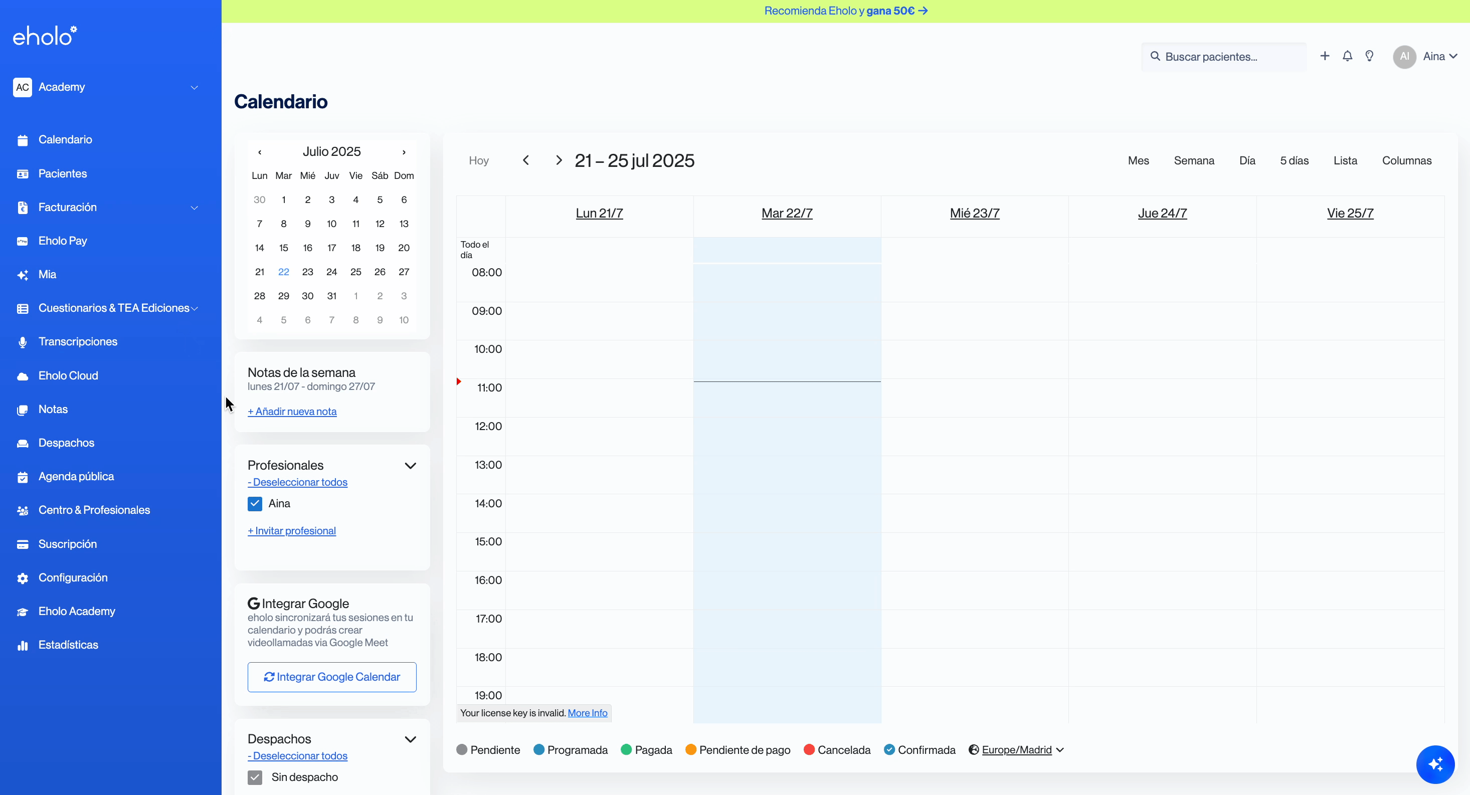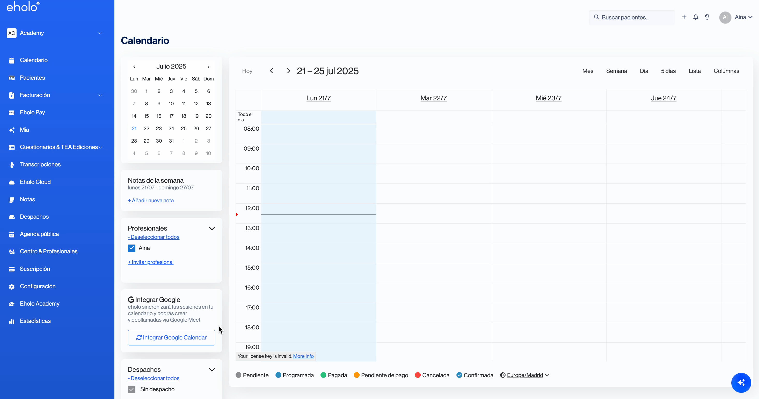 Te recomendamos crear un paciente de prueba con tus propios datos y agendar una sesión contigo mismo. Así podrás: